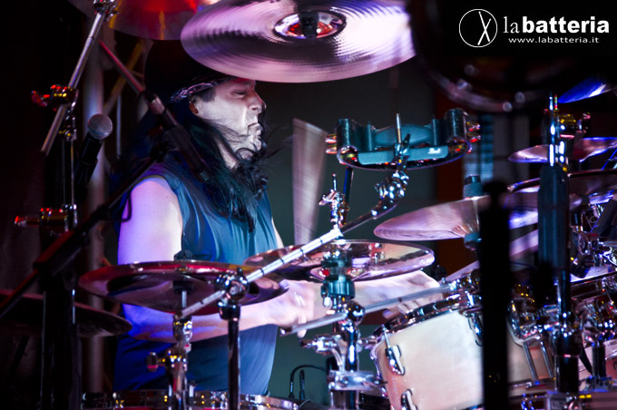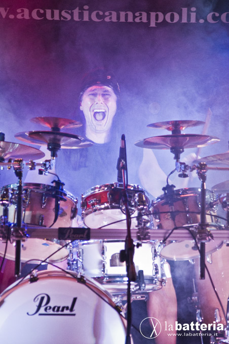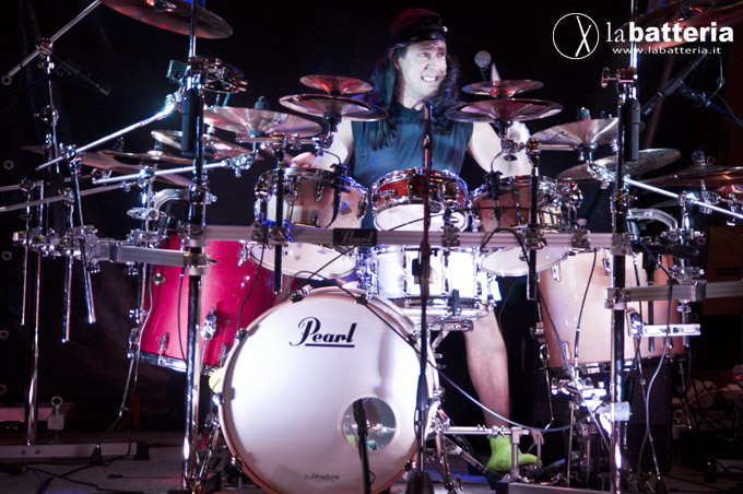 Mangini, endorser Pearl e Zildjian, si é esibito su una MPL Master Limited, assemblata (come sua consuetudine) con i tom disposti simmetricamente intorno ai rullanti: oltre al rullante principale, infatti, Mangini utilizza un secondo rullante di misure ridotte, montato al centro del rack.