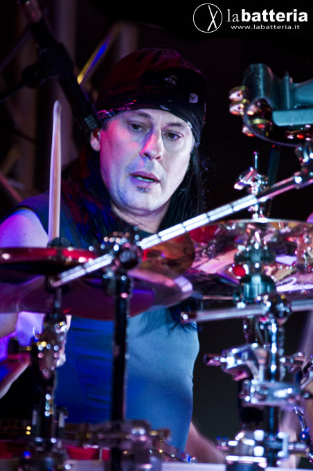 Più volte nella clinic racconta della sua esperienza con i Dream Theater. A partire dall'audizione (nella quale fu preferito a mostri sacri del calibro di Virgil Donati e Thomas Lang), quando fece di tutto per non pensare di essere a un'audizione e non sentirsi sotto esame, fino ad arrivare ai concerti, durante i quali suona per tre ore avendo davanti agli occhi per la maggior parte del tempo il fondoschiena dei suoi compagni di gruppo...! Dopo ogni live con i Dream Theater la band analizza attentamente il concerto in modo da identificare punti deboli nello spettacolo o nell'esecuzione: se c'é un problema in un pezzo é indispensabile capire dov'è, anche perché dietro alla band c'é una troupe tecnica che segue costantemente il concerto (audio, luci, proiezioni...). Lui per esempio ha un video alle spalle con il quale deve essere in sincrono durante tutto il live, inoltre le sue parti sono spesso più complicate di quanto possano sembrare (se mai ce ne fosse bisogno...), e se lui a volte durante i live può sembrare stanco o sovrappensiero, in realtà é solo molto concentrato, condizione indispensabile per focalizzare l'attenzione e suonare parti così complesse. Dal vivo poi possono essere molti gli imprevisti che fanno distrarre, per esempio una bacchetta che si incastra nelle meccaniche, o il cavetto dell'in ear monitor che rimane impigliato al seggiolino, o ancora luci e fumo: é fondamentale quindi rimanere concentrati e riuscire a rientrare a tempo con il brano, anche se si é perso un colpo.
